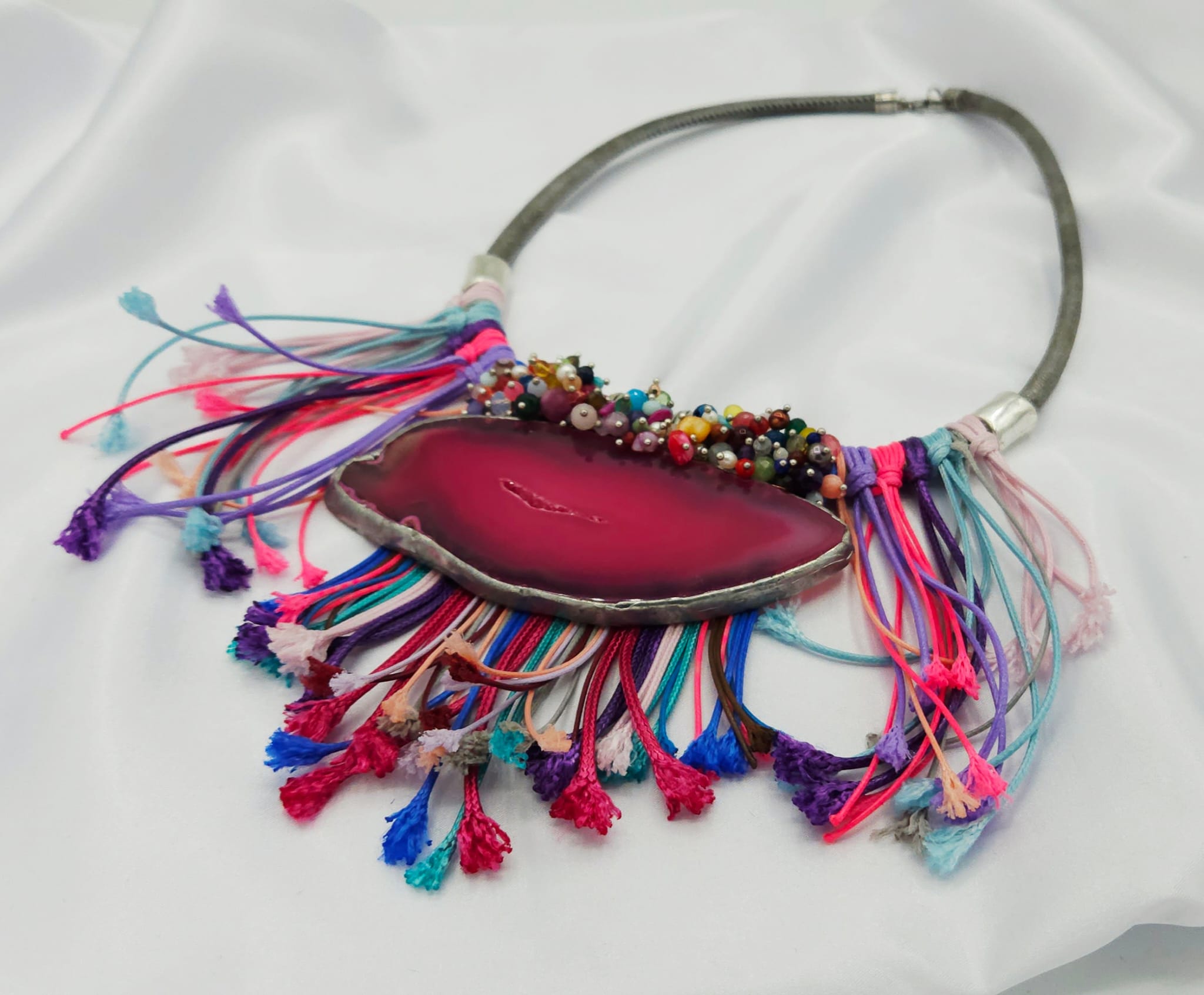 Wyjątkowy, artystyczny naszyjnik z dużą płytką agatu oraz misternie oplecionym miksem naturalnych kamieni — wśród nich masa perłowa, jadeity, perełki, turmaliny i agat. Kolorowe, lekko woskowane sznurki bawełniane dodają mu charakteru boho i tworzą efektowną, pełną energii kompozycję. Naszyjnik wykończony jest stalą nierdzewną, dzięki czemu jest trwały i bezpieczny dla skóry. Idealny dla osób, które kochają wyrazistą biżuterię i chcą podkreślić swój niepowtarzalny styl.