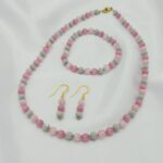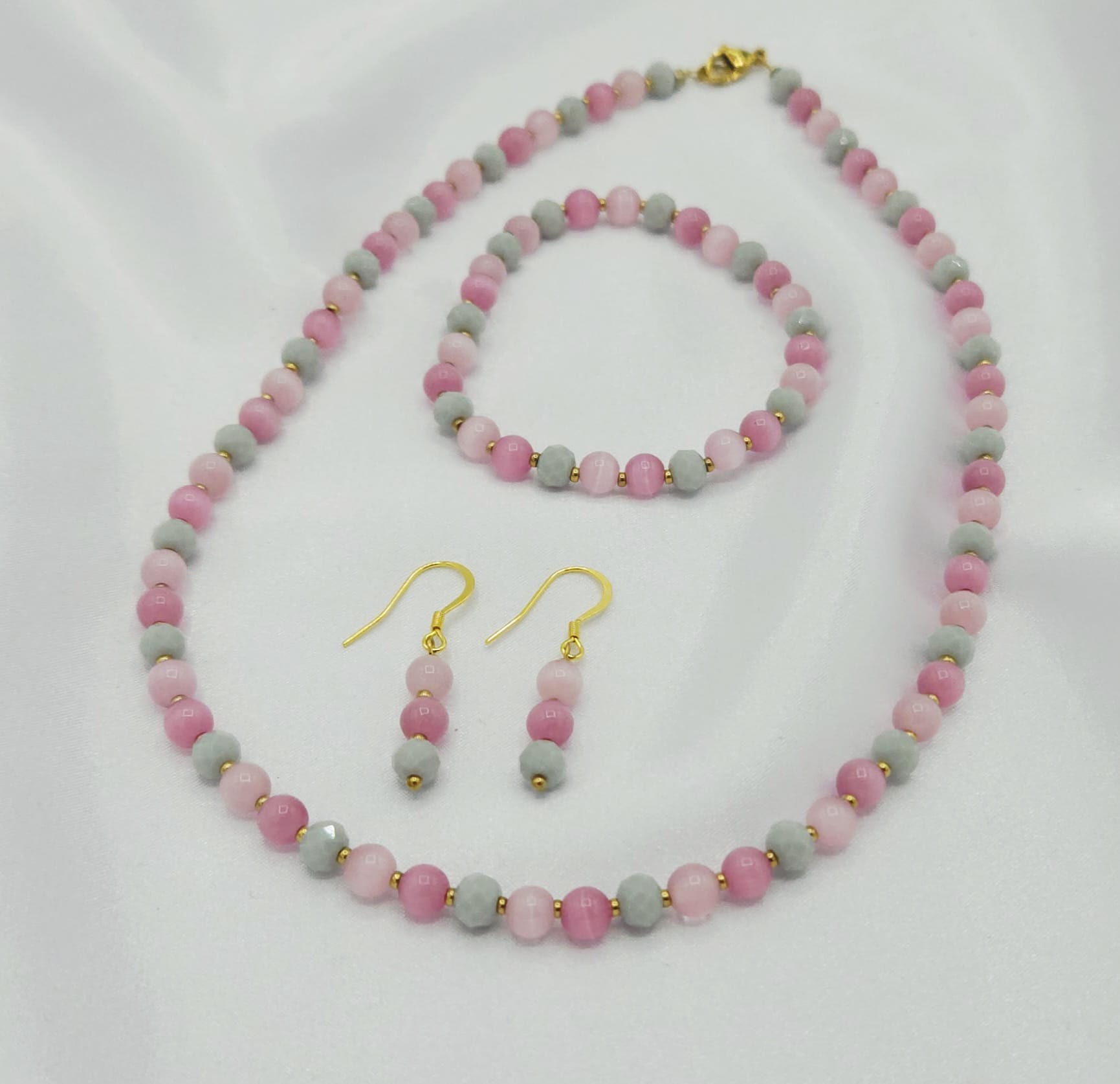 Subtelny komplet biżuterii wykonany z naturalnych jadeitów, kociego oka, hematytu i szlifowanych kryształków. Delikatne połączenie różu i szarości tworzy romantyczną, kobiecą kompozycję, która pięknie podkreśla każdą stylizację. Całość wykończona trwałą stalą nierdzewną, łącząc elegancję z codzienną wygodą.