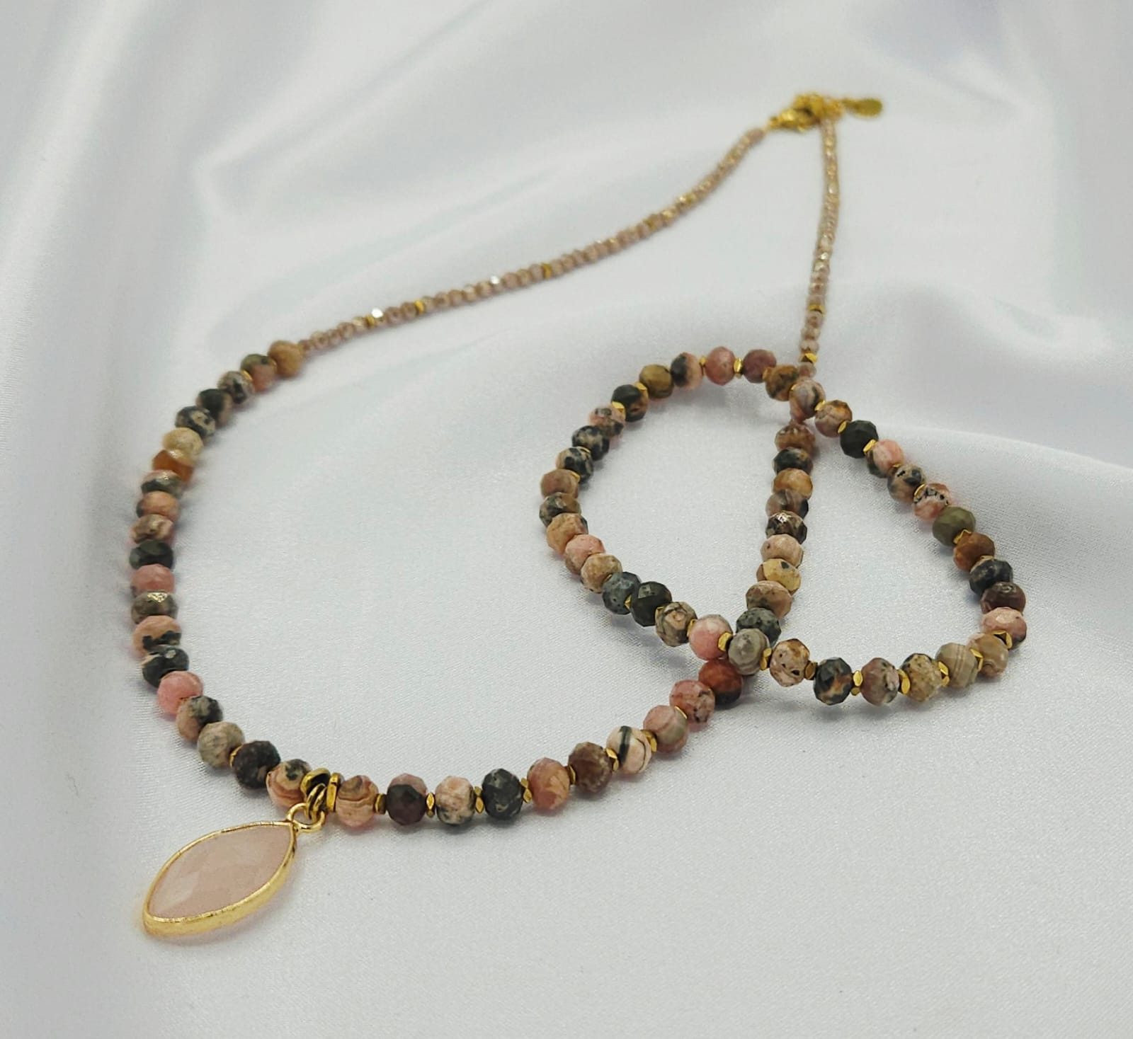 Delikatny komplet biżuterii wykonany z naturalnych kamieni – rodochrozytu, hematytu oraz pozłacanej zawieszki z kwarcu różowego. Ciepłe odcienie beżu, różu i złota tworzą harmonijną, elegancką kompozycję, która dodaje subtelnego blasku każdej stylizacji. Całość wykończona trwałą stalą nierdzewną.