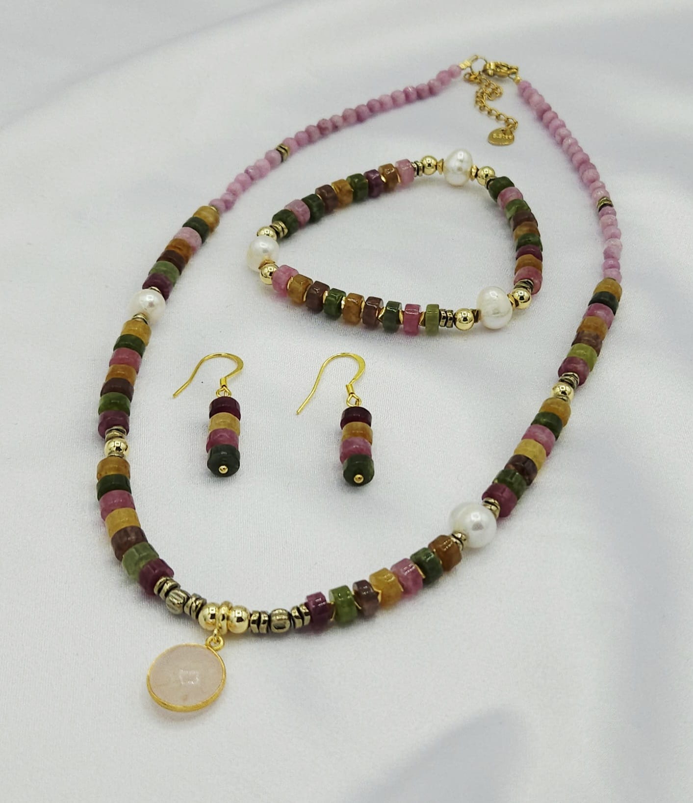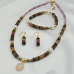 Elegancki zestaw biżuterii z naturalnych kamieni – kolorowych turmalinów, różowego jadeitu, hematytu oraz pereł hodowlanych. Centralnym elementem naszyjnika jest pozłacana zawieszka z kwarcu różowego, symbolizującego miłość i spokój. Połączenie subtelnych odcieni różu, zieleni i złota tworzy wyjątkowo kobiecą i harmonijną kompozycję. Całość wykończona trwałą stalą nierdzewną.